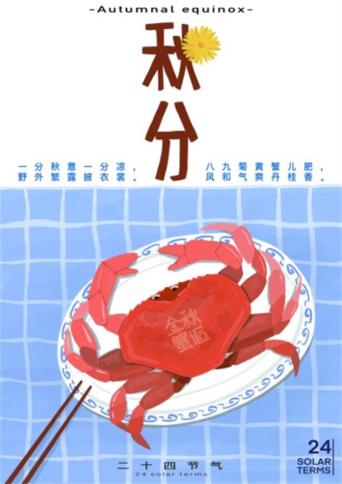 “秋風(fēng)起,蟹腳癢,菊花開,聞蟹來。”把酒持螯,真可謂一件樂事。圖⑥畫面中央的大閘蟹紅艷誘人,寓意豐收與團(tuán)圓;白色盤子與藍(lán)色格子桌布相映成趣,增添節(jié)日溫馨感;黃色的菊花與“秋分”字樣相襯,融合了中國傳統(tǒng)元素與現(xiàn)代審美,傳遞出濃厚的秋分節(jié)氣氛圍。