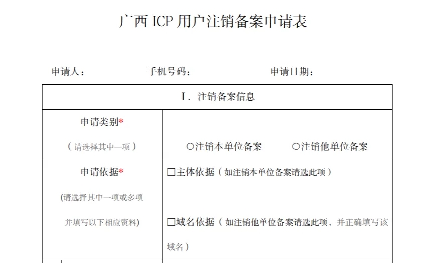 備案注銷需要到備案號(hào)當(dāng)?shù)氐耐ㄐ殴芾砭窒螺d“注銷備案申請表”,按“填表須知”中的要求把申請表里的信息填好,將材料郵寄或送到指定地點(diǎn)即可。處理結(jié)果申請人可自行登錄工信部備案系統(tǒng)“公共查詢”可查詢。以廣西為例: