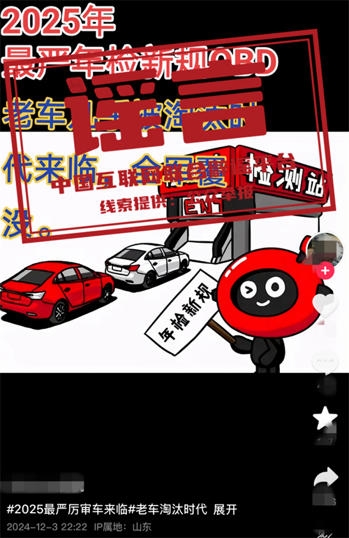 真相:近日,多個(gè)自媒體賬號發(fā)布消息,宣稱“史上最嚴(yán)車檢來了”“車檢年限變化”“燃油車年檢增加OBD檢測”等。中央廣電總臺中國之聲記者多方求證了解到,上述說法均為不實(shí)消息,目前各地車檢并沒有新變化。