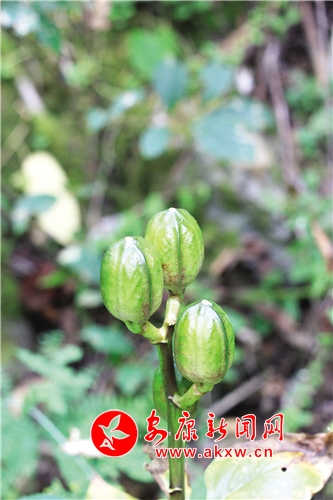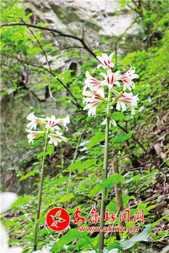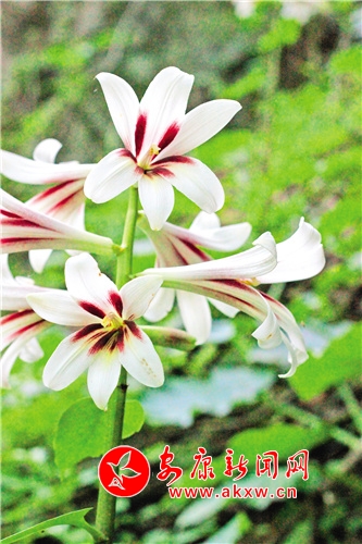 大百合生長(zhǎng)在溪邊的山坡上,筆直的莖稈約一人高,如箭沖天,下部散有幾片寬大的綠葉,上端擎著若干喇叭狀的花兒,潔白中透著紫紅,驚艷得如同一位亭亭玉立卻羞紅了臉的美人。(圖/文 榮海) AWg安康新聞網(wǎng)