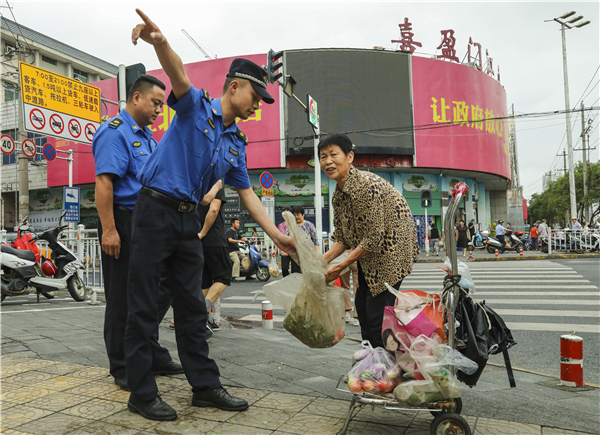 7月23日,江北交警、城管在中渡街整頓交通和農(nóng)貿(mào)市場。(郭曉康)