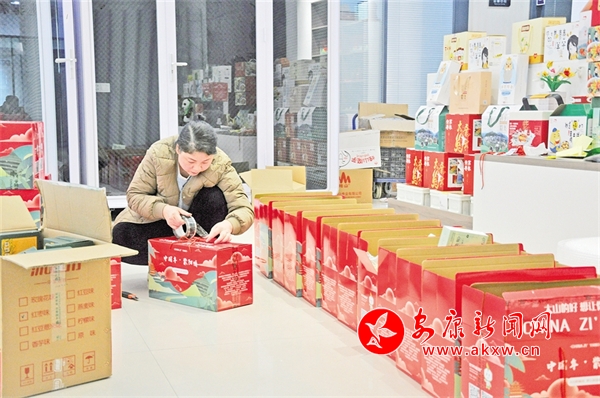春節(jié)臨近,紫陽(yáng)蒸盆子和年貨大禮包通過(guò)電商走進(jìn)了萬(wàn)戶百姓家。目前已銷售紫陽(yáng)蒸盆子4萬(wàn)份,年貨大禮包1000余份。圖為工作人員在打包發(fā)貨。彭召伍 攝cyt安康新聞網(wǎng)