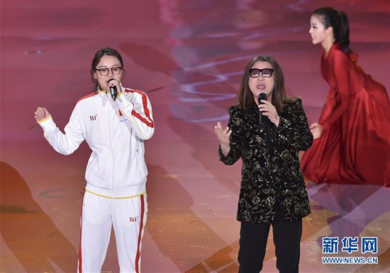 9月8日,游泳運動員傅園慧(左)和歌手郭峰在閉幕式上演唱。 當日,第十三屆全運會在天津閉幕。 新華社記者岳月偉攝