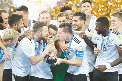 | 7月2日,俄羅斯圣彼得堡舉行的2017年聯(lián)合會(huì)杯足球賽決賽中,德國(guó)隊(duì)以1∶0戰(zhàn)勝智利隊(duì),奪得冠軍。德國(guó)隊(duì)球員在頒獎(jiǎng)儀式上捧杯慶祝。 |