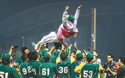 | 天津棒球隊(duì)隊(duì)員將教練高高拋起慶祝奪冠。 |