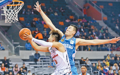 1月23日,青島隊球員蘇偉(后)在比賽中封蓋對手上籃。當日,在2017—2018賽季中國男子籃球職業(yè)聯(lián)賽(CBA)第三十輪比賽中,廣東隊主場以119∶104戰(zhàn)勝青島隊。當日其他比賽結果為:新疆125∶108同曦,山東126∶100四川,江蘇110∶92八一,北京108∶92吉林。X7X安康新聞網(wǎng)