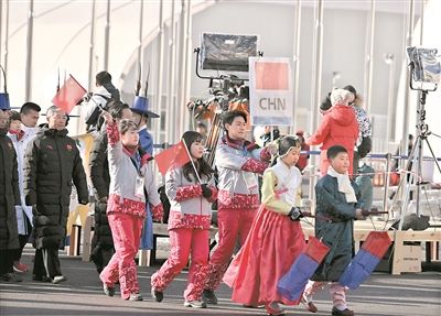 參與今天升旗儀式的中國(guó)體育代表團(tuán)約有80人,在升旗后的表演中可謂是盡顯韓國(guó)特色,從冬奧村村長(zhǎng)到表演人員都是身著韓國(guó)民族傳統(tǒng)服裝,而且很好地將現(xiàn)代與傳統(tǒng)結(jié)合起來(lái),尤其特別的是在結(jié)束時(shí)表演人員盡邀參與升旗儀式的中國(guó)體育代表團(tuán)集體互動(dòng),從而使得現(xiàn)場(chǎng)變成一場(chǎng)載歌載舞的歡樂(lè)“趴”。