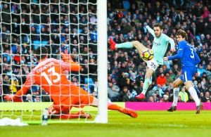 在2017-2018賽季英格蘭足球超級(jí)聯(lián)賽第29輪比賽中,曼城隊(duì)主場(chǎng)以1比0戰(zhàn)勝切爾西隊(duì)。圖為曼城隊(duì)球員貝爾納多·席爾瓦(中)在比賽中破門得分。 新華社/路透