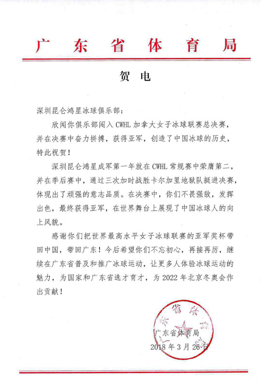 人民網(wǎng)3月26日電 北京時(shí)間3月26日零時(shí),CWHL(加拿大女子冰球職業(yè)聯(lián)賽)克拉克森杯總決賽打響,由深圳昆侖鴻星對(duì)戰(zhàn)萬(wàn)錦迅雷隊(duì)。本場(chǎng)比賽,昆侖鴻星第一節(jié)先失一球,第二節(jié)由史塔克將比分扳平。加時(shí)賽中,萬(wàn)錦迅雷隊(duì)斯塔西打入絕殺球,最終昆侖鴻星以1-2加時(shí)憾負(fù)萬(wàn)錦迅雷隊(duì),但獲得亞軍仍然是中國(guó)冰球在世界頂級(jí)冰球職業(yè)聯(lián)賽中取得的最好成績(jī)。賽后,廣東省體育局發(fā)來(lái)賀電,對(duì)深圳昆侖鴻星奪得CWHL亞軍表示祝賀。賀電全文如下: