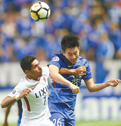 | 4月3日,上海申花隊(duì)球員秦升(右)在比賽中和對(duì)手爭(zhēng)頂。 |
