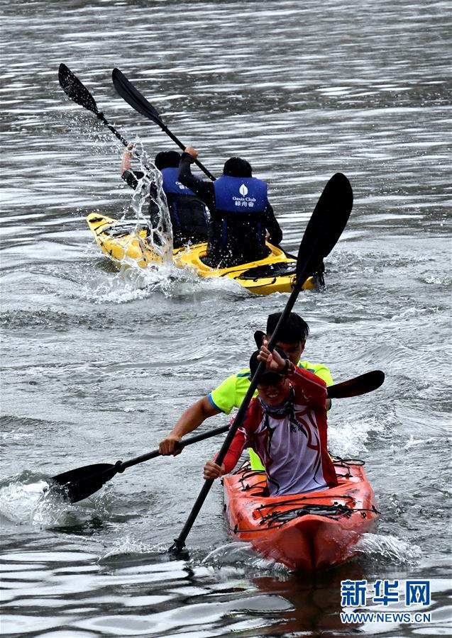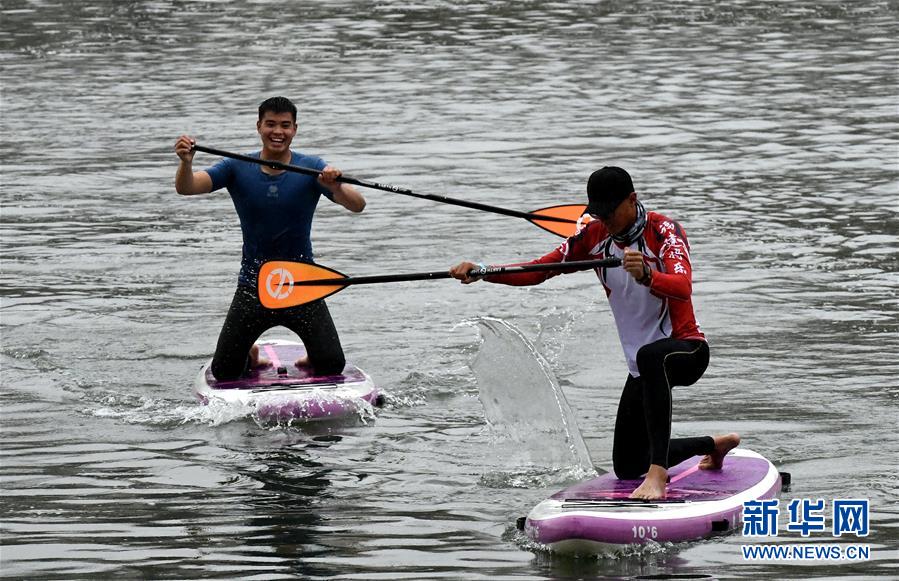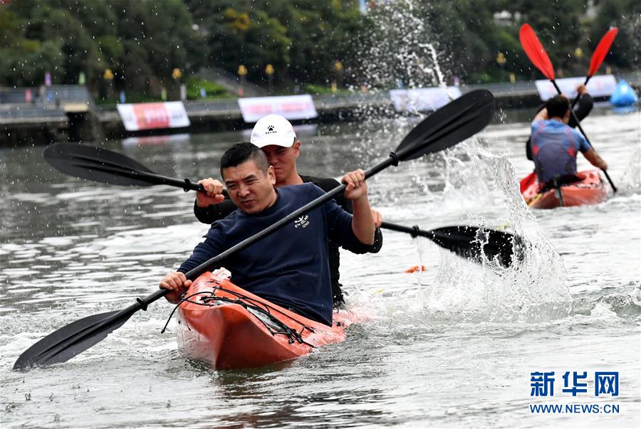↑11月16日,皮劃艇拔河賽選手在比賽中。 當日,2018年福建將樂皮劃艇趣味賽在將樂縣金溪河開賽。本次比賽設(shè)皮劃艇拔河、皮劃艇接力、槳板競渡3個項目,吸引了福建、吉林等國內(nèi)120名選手參與。 新華社記者彭張青攝