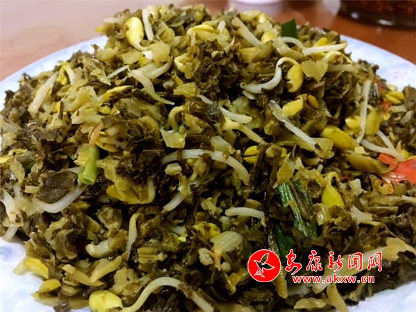 兩摻面摻好后醒的過程中,從酸菜壇子里撈出清亮的酸菜,配蒜瓣、姜末、蔥段、蒜苗、干辣子為佐料,韭菜、豆芽為輔料,一起下鍋炒熟,地道的安康酸菜出鍋,靜候與兩摻面的相逢。