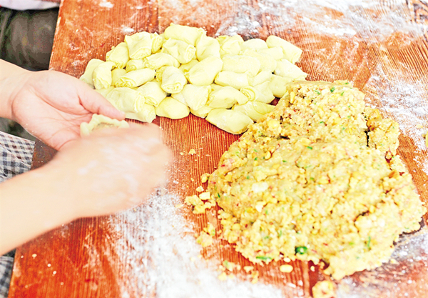 制皮、制餡、制酥、包酥、成型、蓋章、扎眼……四個人在操作時不言不語,只顧埋頭做活!