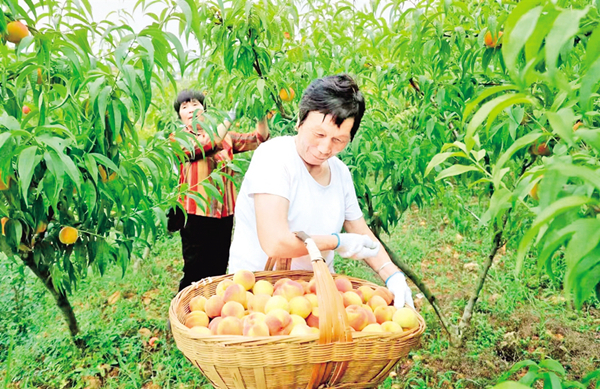 “這個(gè)桃子好甜噢,你也來嘗嘗!”桃園里呼朋喚友的聲音此起彼伏,游客們暢游其中享受著采摘的樂趣。