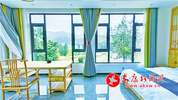 半山腰的獨(dú)棟別墅白墻黑瓦,飛檐峭壁,處處滲透著平淡質(zhì)樸的古典韻味;张山ㄖ骋星嗌,面朝峽谷,壩河水在谷間緩緩流淌。別墅里每一間都布置得精致高端,站在二樓落地窗前,觀連綿青山,賞花鳥(niǎo)飛禽,讓人陡然間心靜如水。