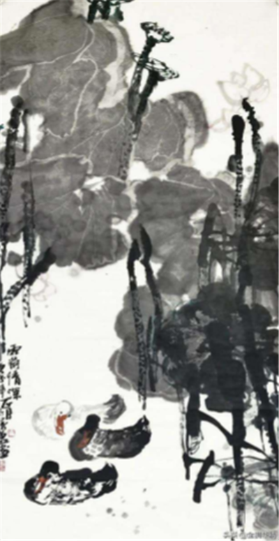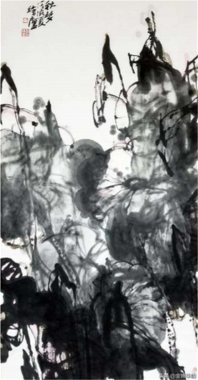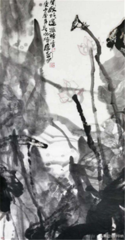 其中,《風(fēng)搖荷花聽雨聲》這幅國畫作品令我記憶尤深,畫面尺寸為 180×96 厘米,整幅畫采用寫意手法,虛實相生,荷葉由近及遠(yuǎn),由實到虛,畫面色調(diào)以黑白為主,簡約又包容萬物,墨色濃淡有致,筆法干脆利落,含蓄中帶著一股蓄勢待發(fā)的張力,構(gòu)圖飽滿,幾片荷葉占據(jù)了畫面的主要部分,在荷葉群中不時穿插幾朵荷花、蓮藕,荷葉的輪廓從前至后,由清晰至模糊,營造了一種水汽氤氳感,荷花隨風(fēng)擺動,遠(yuǎn)處的荷葉似乎和水面渾然融為一體的畫面,荷花與水色天光互為襯托,靈動生機(jī),畫家將荷花人格化,以荷言志,贊賞荷花在雨中傲然挺立的高潔風(fēng)骨,憐惜荷花飽受風(fēng)雨的摧殘,以此為畫面精神支點,物我合一,從自然界植物的角度感受世間百態(tài),看著這幅畫,仿佛置身煙雨迷離,以游人眼光靜靜觀賞荷花搖曳之姿,在水墨流動中,體味傳統(tǒng)審美意象之氣脈,感受荷花的“出淤泥而不染,濯清漣而不妖”的淡泊雅致……