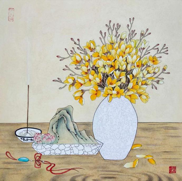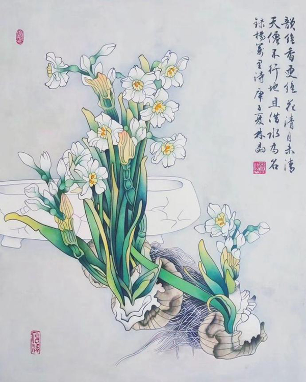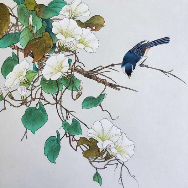 簡而言之,林晶女畫家的工筆花鳥畫,無論在構(gòu)圖上、線條上、設(shè)色上都彰顯出自己的“功夫”。她的每一幅畫,都那樣艷而不俗、淡而有味,讓人有百看不厭的舒暢感。