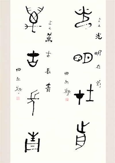 字如其人,古來一直有此一說,我每每觀之,總會想起元代馬致遠的散曲“枯藤老樹昏鴉,古道西風瘦馬”那樣的寫意。后期他突然對金文有了興趣,自己琢磨著寫起了金文。金文是繼甲骨文之后發(fā)展到第二階段的中國文字,是刻在銅器、鐘鼎上的,也屬于象形文字,時間上處于篆字和隸書之前。我開始不明白老師怎么轉(zhuǎn)型寫起這種字來了,也許是愛好、是喜歡吧,也許是一種永不渴止的新的追求,但這兩種字給人的美感享受,卻是懂與不懂書法的人都一致認可的。