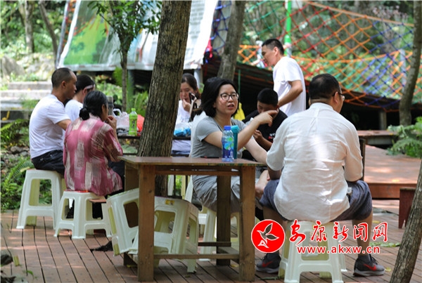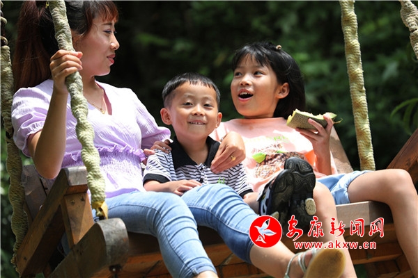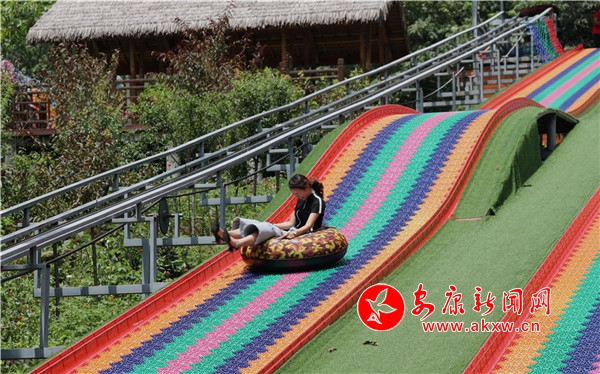 往來翕然,游人如織。幾個稚童像百靈般迅捷,雀躍的身影在青竹翠蔓間穿梭,很快便隱沒了身形,只余下串串清脆的歌聲,與林間蟬鳴一唱一和。妙齡姑娘,隨性地從五彩滑道旋轉(zhuǎn)直下,如履云端,恍若驚鴻。柔情脈脈的戀人,安享著山澗的幽靜,互訴衷腸,期冀著美好的未來。