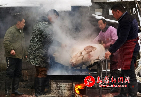 時(shí)逢陰歷十月初九,鎮(zhèn)坪縣迎來(lái)了入冬以來(lái)第一場(chǎng)降雪。漫天大雪,給原本氣溫偏低的化龍山腳下的張家坪增添了寒冷。然而,上竹鎮(zhèn)化龍村8組村民張成凱和叔叔張秀柱,卻帶著家人熱火朝天地忙著殺豬腌制臘肉,絲毫沒(méi)有寒冷的感覺(jué)。